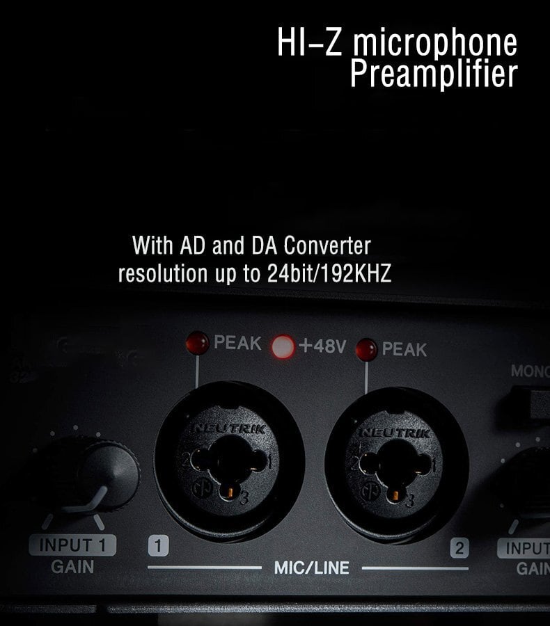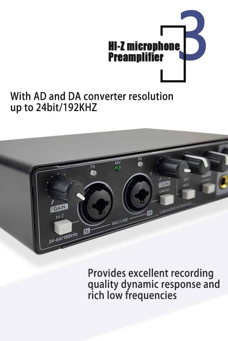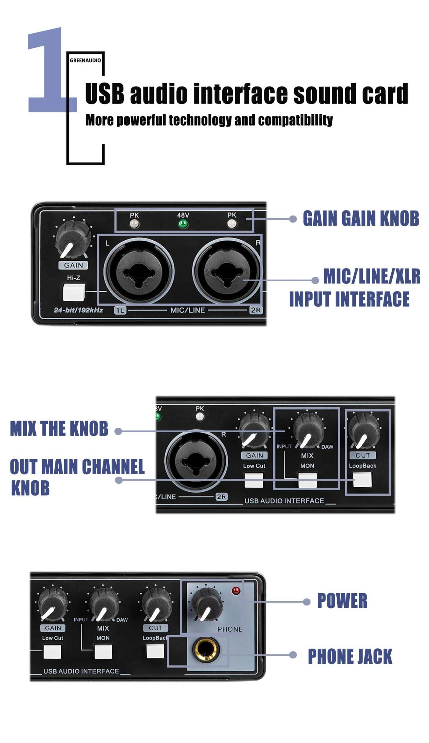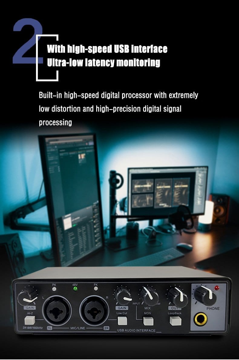 MD22 Recording Sound Card 48V Phantom Power USB Audio Interface Portable Professional Sound Card 24-bit/192 KHZ Low Latency Monitor with Loopback for Audio Equipment Guitar.